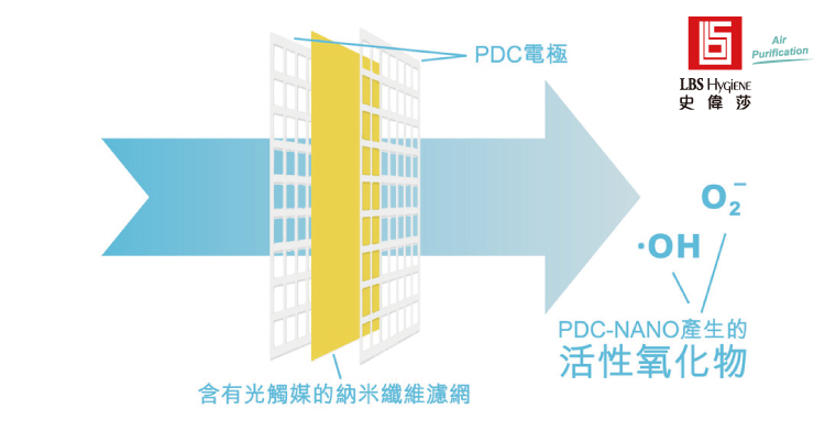 PDC-NANO拥有与香港创新科技署成立的「香港研发中心 NAMI」一同研发的专利技术「等离子驱动催化技术 (PDC)及纳米纤维滤网 (NANO)」,含有光触媒的纳米纤维滤网,非常有效阻隔空气颗粒,困着空气中的病毒、细菌及挥发性有机化合物,再由PDC杀灭或分解,减低二次污染;更能主动释放活性氧化物,分解四周有害物,转化成水和二氧化碳等无害物。